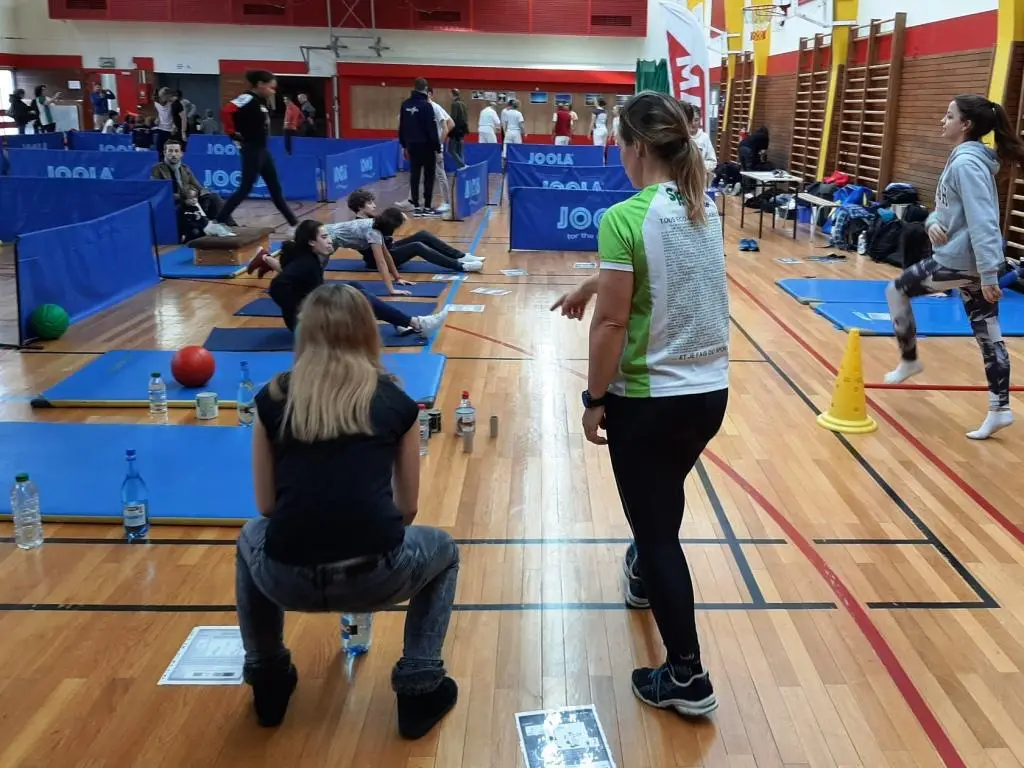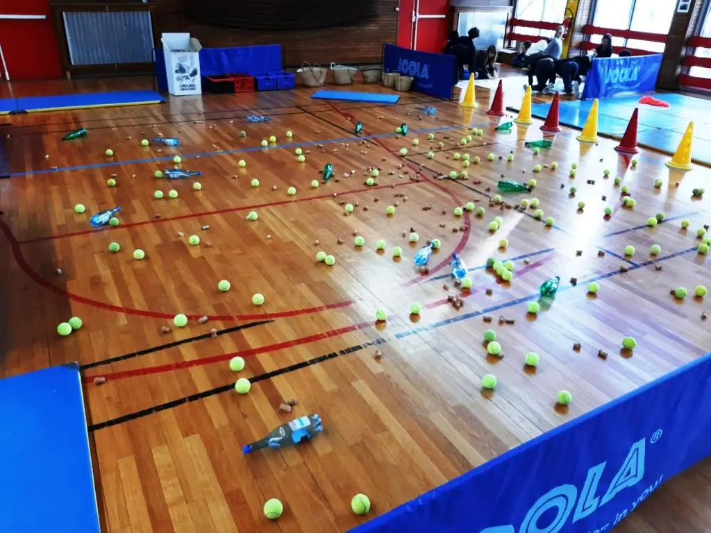 Crossfit recyclage: échauffement de type Tabata suivi d’une course-navette pour collecter et trier des déchets spécifiques, « matière première » pour la réalisation d’ateliers de renforcement musculaire (barres de squats, corde à sauter, haltères, step).